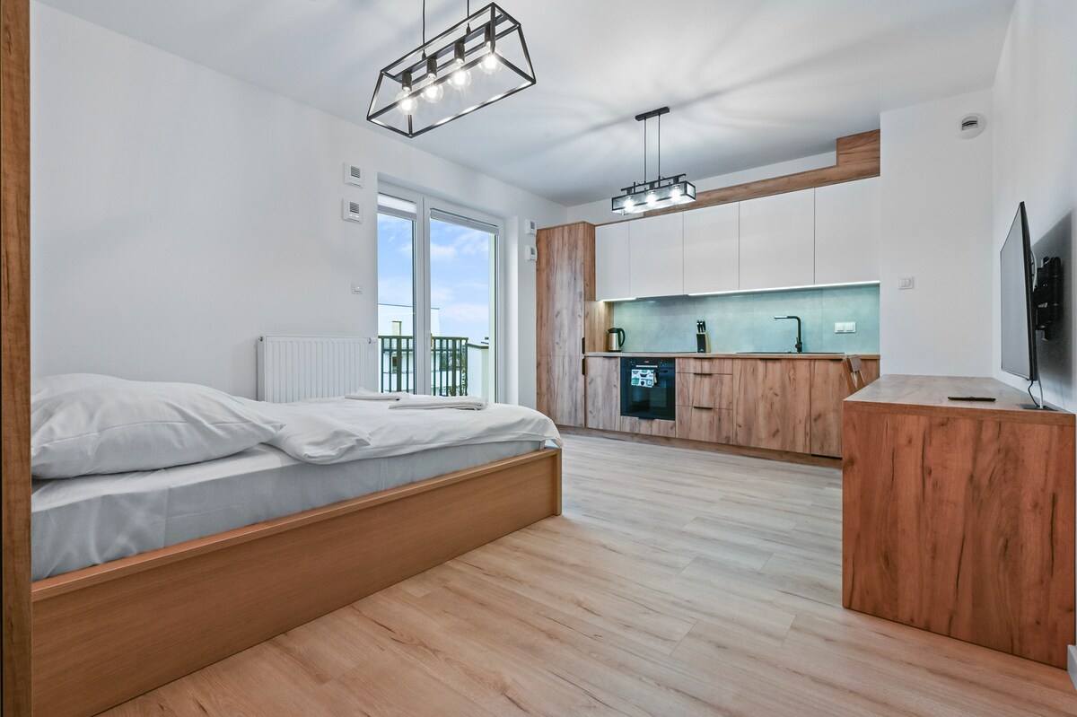 Przytulne i funkcjonalne studio z prywatną łazienką oraz aneksem kuchennym, położone na drugim piętrze budynku. Mieszkanie jest w pełni wyposażone i urządzone z myślą o komforcie jednej lub dwóch osób. Aneks kuchenny umożliwia swobodne przygotowywanie posiłków i jest zaopatrzony we wszystkie niezbędne naczynia. Dogodna lokalizacja, tylko 14 minut jazdy samochodem od lotniska Chopina. W okolicy budynku dostępne są bezpłatne miejsca parkingowe.