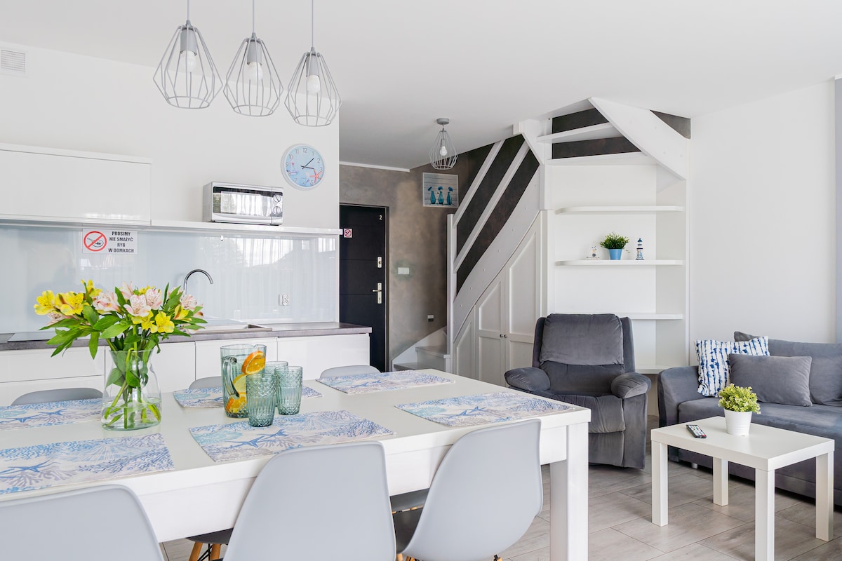 Siūlau jums naujai pastatytą namą su visiškai atskirais dviem butais, esančiais ramioje Świecino vietovėje. 2000 m ploto, aptvertas, apsuptas miško ir svečiams prieinamas sklypas. Butas 8 žmonėms. Viršutiniame aukšte 2 miegamieji, viena dvigulė lova ir viena viengule lova kiekviename miegamajame ir papildomas vonios kambarys. Pirmame aukšte yra svetainė su sofa-lova. Aneks kuchenny oraz druga łazienka, TV, internetas Wi-Fi.