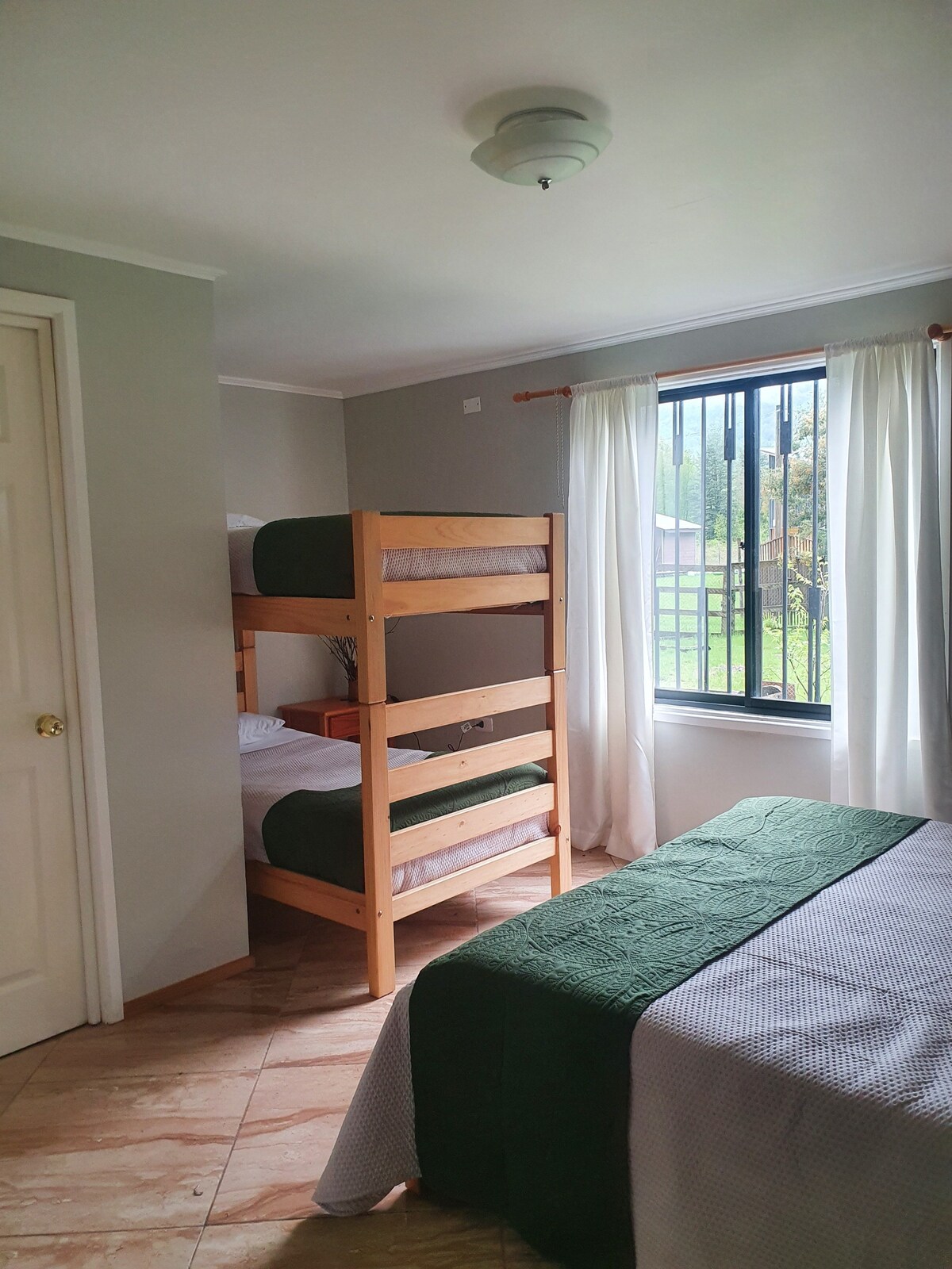 Ši 4 miegamųjų, 2 vonios kambarių trobelė/namas, kuriame telpa 9 žmonės, yra tarp Villarrica ir Pucon (9,5 km). Jame yra didelės ir gražios pievos, baseinas su grotelėmis, quincho c/vonios kambarys, vaismedžiai ir ekologiškas sodas. Jame nėra patalynės ir rankšluosčių.