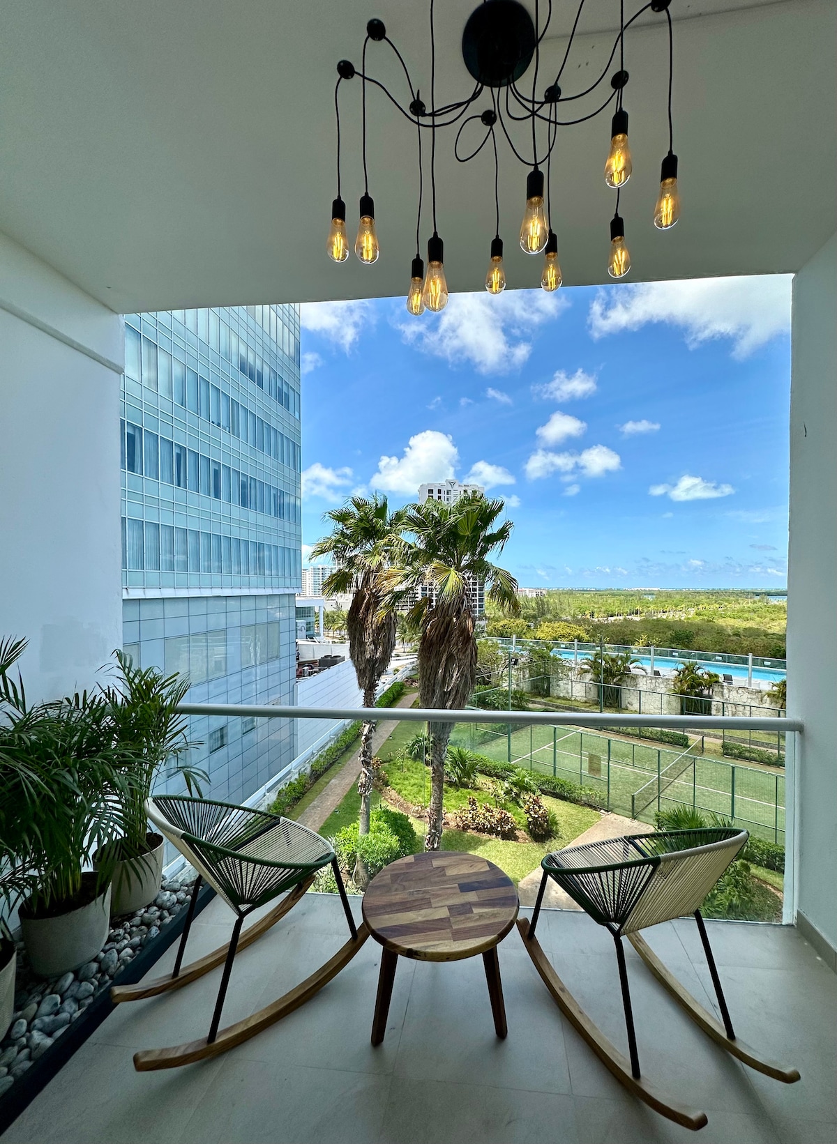 Vive la experiencia de hospedarte en un lujoso departamento de 3 recámaras en Cancún, con espectaculares vistas al parque y la Zona Hotelera. Ideal para familias, grupos o viajes de trabajo, combina elegancia y confort con entretenimiento. Disfruta de una amplia sala con TV de 75” y PlayStation 5, comedor para 6 personas, cocina moderna con barra desayunadora, lavadora y secadora, estacionamiento para 2 autos y una hermosa alberca compartida.