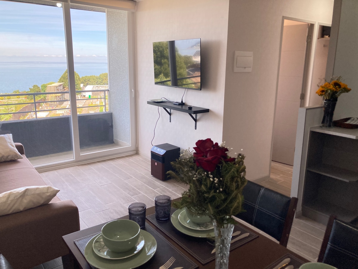 Atsipalaiduokite šioje unikalioje ir ramioje išvykoje netoli Puerto Montto centro. Gražus vaizdas į vandenyną iš viso buto (7 aukštas), šalia Australijos kelio. Labai arti maisto vietų, privačių turgų, Universidad Austral de Chile, mokyklos San Javier ir Pelluco paplūdimio ir kitų panoramų. Mikrobusas sustoja už 4 kvartalų nuo daugiabučio, einančio palei miesto krantinę, pravažiuojančio pro autobusų stotį.