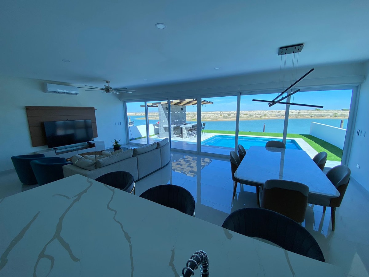 SUSIPAŽINKITE SU MŪSŲ GRAŽIUOJU NAMU „PERLA BLANCA“ Šiuolaikiško ir prabangaus dizaino būstas su vaizdu į sūraus vandens lagūną yra Isla Conchilla rajone, kurorto „Islas del Mar“ teritorijoje. Mūsų namų pasiūlymas: 1) Privatus baseinas su vaizdu į nuostabią sūraus vandens lagūną, vos už kelių žingsnių nuo paplūdimio. 2) Išskirtinė vieta 3) Turime Wi-Fi internetą. 4) Turime dujinę kepsninę, laužavietę su stalais ir kėdėmis. 5) Irklenčių lenta ir baidarė paruoštos jūsų asmeniniam naudojimui