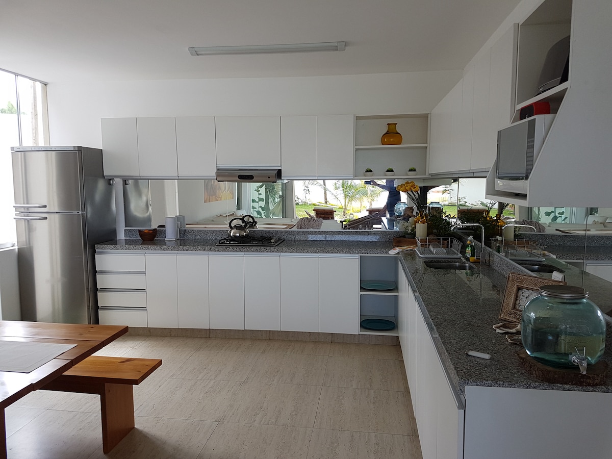 Namas pilnai įrengtas ir jame yra visą parą veikianti apsauga Keturi miegamieji, visi su vonios kambariu, dvigule lova, trobele, išmaniuoju televizoriumi su kabeline televizija, terasa su hamaku, visi su vonios kambariu. WI-FI Svarbu atkreipti dėmesį į priežiūros darbus, kurie gamins lovas ir valys. Taip pat galėčiau pasikliauti virėjo paslaugomis, kad paruoščiau skanius patiekalus šioje vietovėje. Namas yra ant kranto, jame yra graži didelė pavėsinė, apsauganti jus nuo saulės, su foteliais, taip pat yra baseinas
