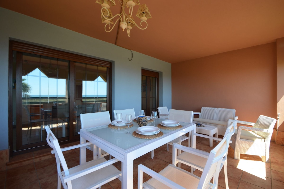 Apartamentai paplūdimyje su 2 balkonais/terasomis (vienas balkonas nukreiptas į pietus, vaizdas į paplūdimį, puikiai tinka degintis, skaityti ir valgyti žiūrint į vandenyną; kitas balkonas nukreiptas į šiaurę, vaizdas į Guadianos upę).