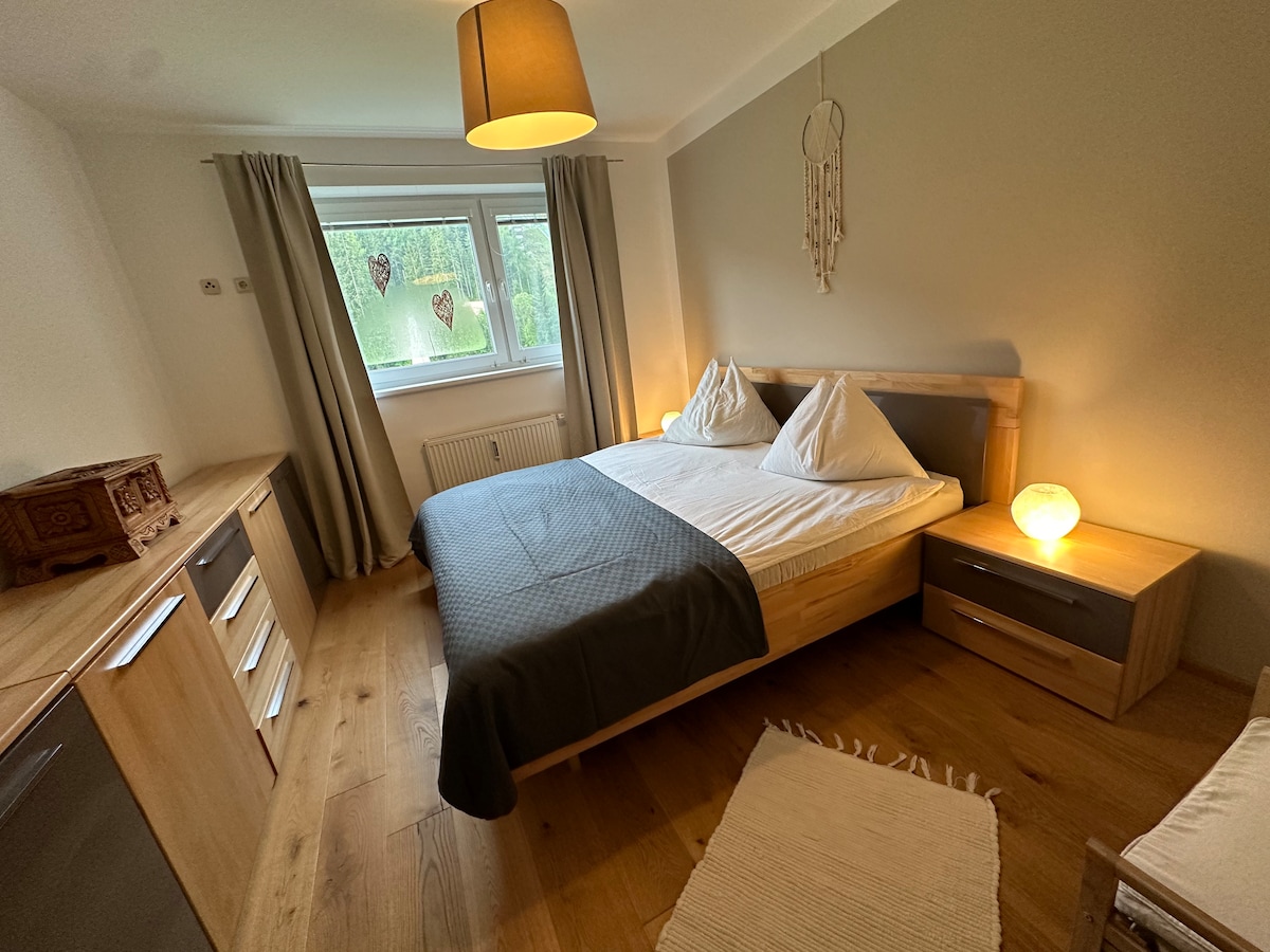 The apartment is located on the ground floor and consists of two bedrooms, a bathroom with toilet, and a kitchen. 10 minutes to the town center, grocery store, and indoor swimming pool with sauna in the immediate vicinity. Parking is available on the property. A bread roll delivery service is available, or you can have breakfast in town (Sattlers, Steffl Bakery). Ski storage for two people at the gondola station is included. Dogs are welcome.
