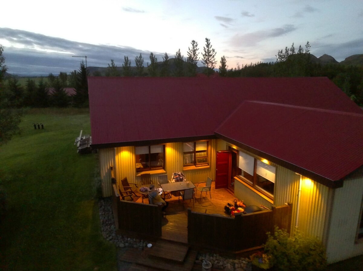 Mūsų svečių namus pastatė mano tėvai su idėja, kad senais laikais jie bus panašūs į vikingų namus: didelė atvira erdvė, padalyta į tris dalis. Tai nėra per daug išgalvota, bet čia yra visi būtiniausi reikmenys! Taip pat galite naudotis dviem papildomais vonios kambariais ir dušais bei sauna. Ūkyje klajoja arkliai, avys, vištos ir šunys! Apgyvendinimo vieta yra strateginėje vietoje, maždaug už valandos kelio nuo Reikjaviko, nuo Viko juodojo smėlio paplūdimių ir nuo Auksinio apskritimo.