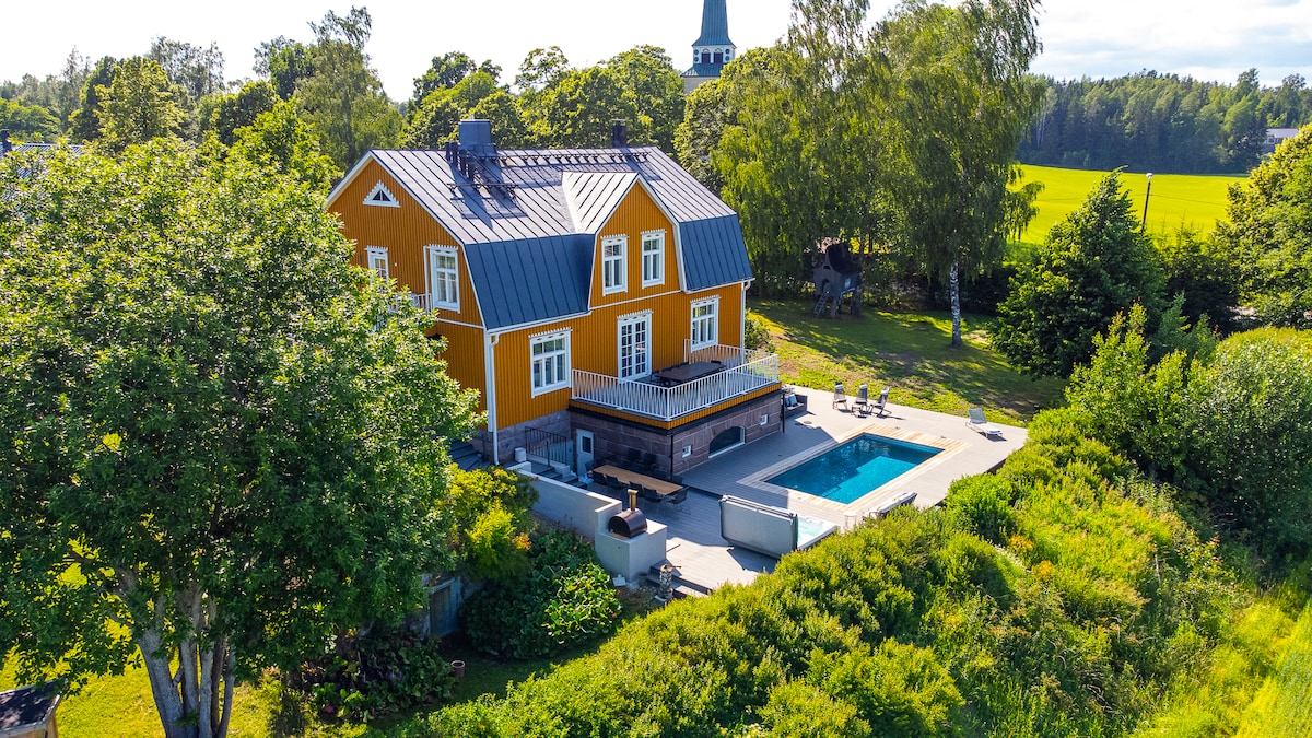 Iš unikalaus Villa Korhola būsto galite užsisakyti atskirą Saunala pastatą su 2 miegamaisiais, tualetu, vonios kambariu ir elektrine pirtimi. Į jūsų užsakymą įeina baseinas ir sūkurinė vonia, žaidimų aikštelė, sporto salė ir paplūdimio pirtis. Gaminti galima gerai įrengtoje vasaros virtuvėje ir kepsninės zonoje. Galite naudotis terasos zonomis. Vienu metu patalpose apsistoja vienas vakarėlis. Kad galėtumėte mėgautis būstu savarankiškai. Šeimininkai gyvena pagrindiniame pastate ir rūpinasi jūsų komfortu.