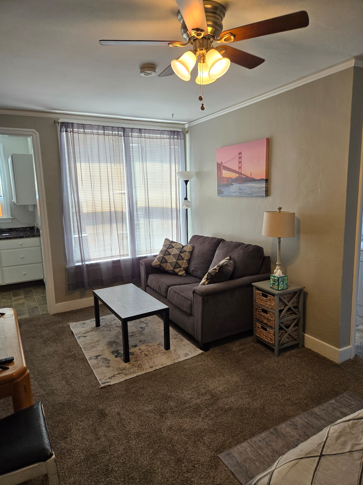 1906 m. istorinis pastatas, 2 aukštas, 1 miegamasis, 1 vonia, virtuvėlė, nauji vakarietiško stiliaus baldai ir dekoracijos, kondicionierius, šildymas, įėjimas su kodu, aikštelė ir automobilių stovėjimo aikštelė, laiptai iš restoranų, pašto, parduotuvių, barų; 1/2 mylios iki I-5 greitkelio; 1 kvartalas nuo pagrindinės gatvės, senojo teismo ir sezoninio trečiadienio vakaro ūkininkų turgaus. Aukštos lubos su vaizdu į miesto centrą. Negalima apsistoti su augintiniais, rūkyti, skalbti. Savarankiškas atvykimas. Patogi miesto centro vieta reiškia, kad galite girdėti gatvės eismą, muziką iš vietinio baro ir netoliese esančio traukinio.