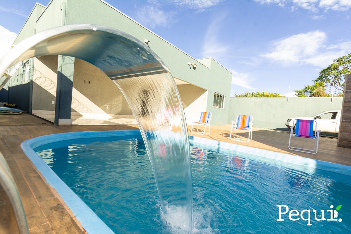 Contamos com espaço de festa para sua família curtir e piscina com cachoeira. Sendo 3 suítes, cada uma com banheiro privativo e com cama de casal todas elas, temos mais 3 colchão de solteiro e sofa onde pode acomodar mais 1 pessoa cada colchao. Alem dos 3 banheiros das suítes, temos mais 1 banheiro interno e 1 no espaço gourme. Sala com TV e sofa, cozinha com mesa de jantar. ( todos quartos tem ar condicionado e a sala tem ventilador)