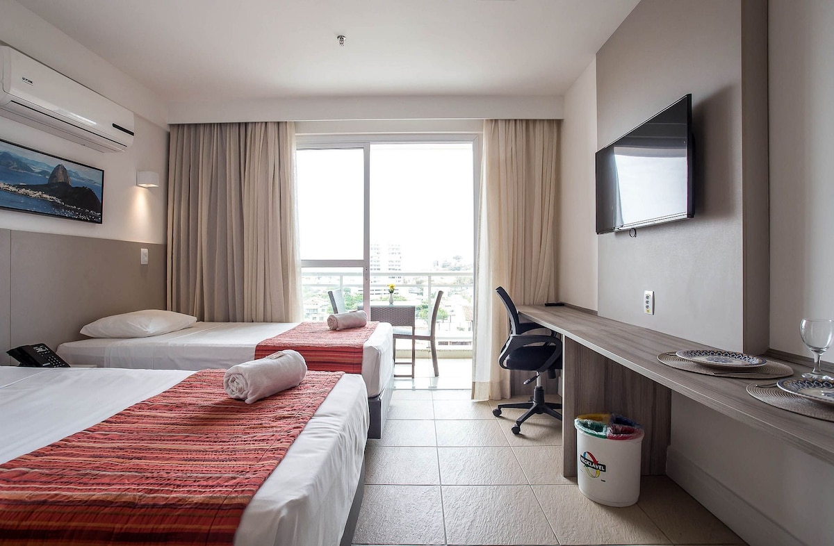 Atraskite buto Nr. 905 - 28 m² buto su dideliu balkonu, iš kurio atsiveria vaizdas į miestą ir Imbetiba paplūdimį, komfortą ir praktiškumą. Mūsų bute gali apsistoti iki 2 žmonių ir jame yra: Dvi viengulės karališko dydžio lovos su atskiru oro kondicionieriumi, Minibaras, mikrobangų krosnelė, vandens filtras, kavos aparatas, Lygintuvas, 32 colių televizorius, Wi-Fi ir nešiojamojo kompiuterio stalas darbui iš namų.