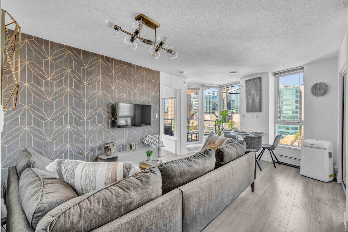 Welcome to your Gastown corner residence, where floor to ceiling windows stretch across the living room, kitchen, and both bedrooms, putting the Vancouver skyline on full display from every angle. Two queen bedrooms with private en suite bathrooms. A private balcony overlooking the downtown skyline. Walking distance to BC Place, Vancouver Convention Centre, Canada Place, Rogers Arena, and Waterfront SkyTrain Station. Secure underground parking and dedicated workspace included.