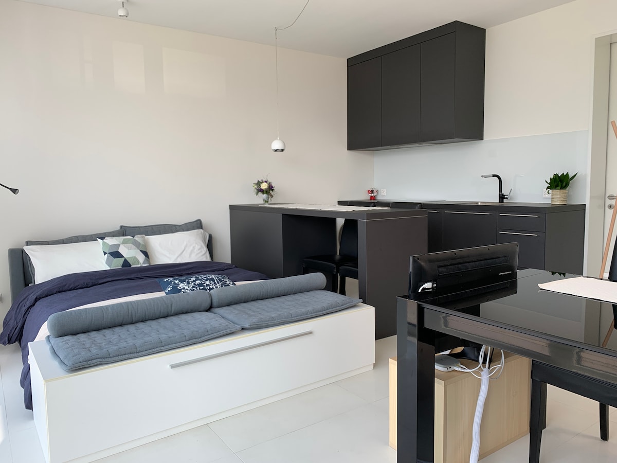 Privati studija su atskiru įėjimu ir privačia ant stogo esančia terasa (30 m2) su kvapą gniaužiančiu vaizdu labai diskretiškoje vietoje. Mėgaukitės nuostabia kelione dviems. Studijoje (40 m2) yra įėjimo zona, svetainė su baldais ir visiškai funkcionalia virtuvėle, vonios kambarys su praustuvu ir miegamoji zona su dvigule lova tiesiai lango priekyje. Suteikia įspūdį, kad plūduriuoja virš vandens. Nuo 2025 m. lapkričio mėn. išmanioji televizija su „Netflix“ Pasirinktinai galima rinktis E-Trike patirtį