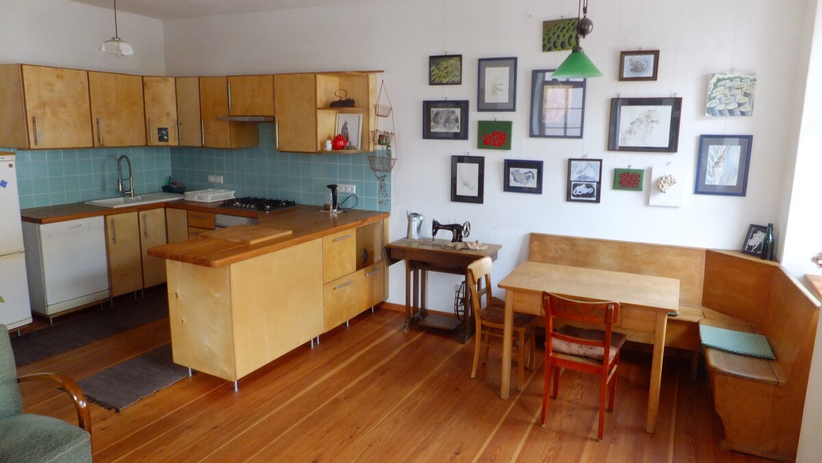 Mūsų istoriniame mokyklos pastate su nuostabiai aukštomis lubomis ir storomis smiltainio sienomis yra daug vietos (apie 130 kvadratinių metrų) iki keturių žmonių. Iki 2013 m. jį su meile renovavome. Apačioje yra didelė virtuvė - svetainė, viršuje - jaukus mažas miegamasis ir didelė studija, kuria taip pat gali naudotis meniškai ambicingi svečiai. Iš Gräfenhausen galite važiuoti kalnų dviračiu arba pėsčiomis tiesiai į Palatinate mišką. Artimiausia laipiojimo uola taip pat yra už 20 minučių kelio pėsčiomis. Kaime yra nedidelis restoranas su kaimo parduotuve ir kepykla (abu tiesiai priešais namą).