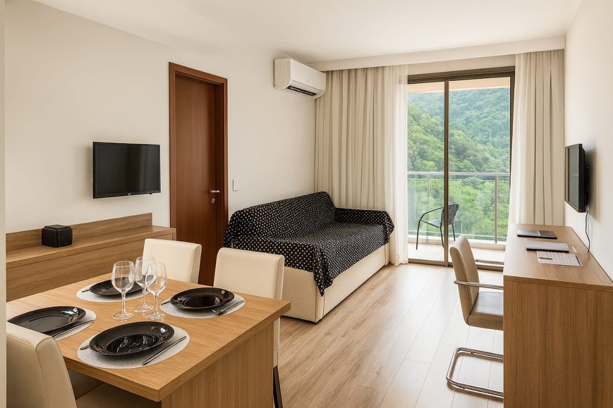 Atsipalaiduokite šioje ramioje, stilingoje erdvėje. Gražūs ir žavingi apartamentai su balkonu į saulėtekį. Nepriklausomi apartamentai su vaizdu į marias/Riocentro. Puikiai tinka poroms ir žmonėms, keliaujantiems vieni laisvalaikio/darbo tikslais. Erdvus vonios kambarys; kambarys su Wi-Fi, Smartv, mini baru, mikrobangų krosnele, elektriniu virduliu, dvigule lova; balkonas su stalu ir kėdėmis. Lengvas perkėlimas programėlės automobiliais, dengtu ir saugiu garažu, be pažymėtų vietų. Kondominiume yra sporto salė ir restoranas.