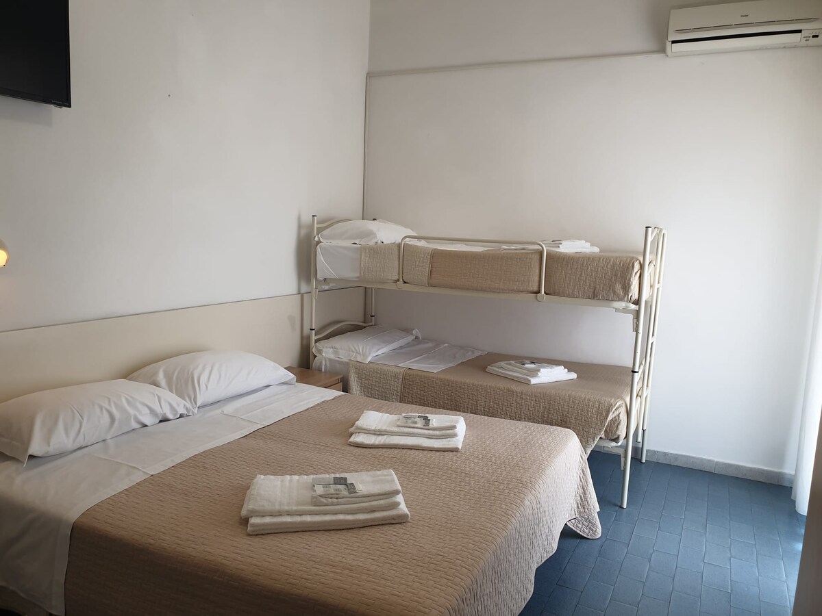 Trivietis kambarys, kaip ir kiti mūsų kambariai, yra labai arti jūros. Jame yra visi patogumai ir: balkonas, kai kurie su vaizdu į jūrą - vonios kambarys su dušo kabina – mandagumo rinkinys – plaukų džiovintuvas, oro kondicionierius, saugus ir belaidis internetas. Trivietis kambarys NĖRA NEPRALAIDUS GARSUI.