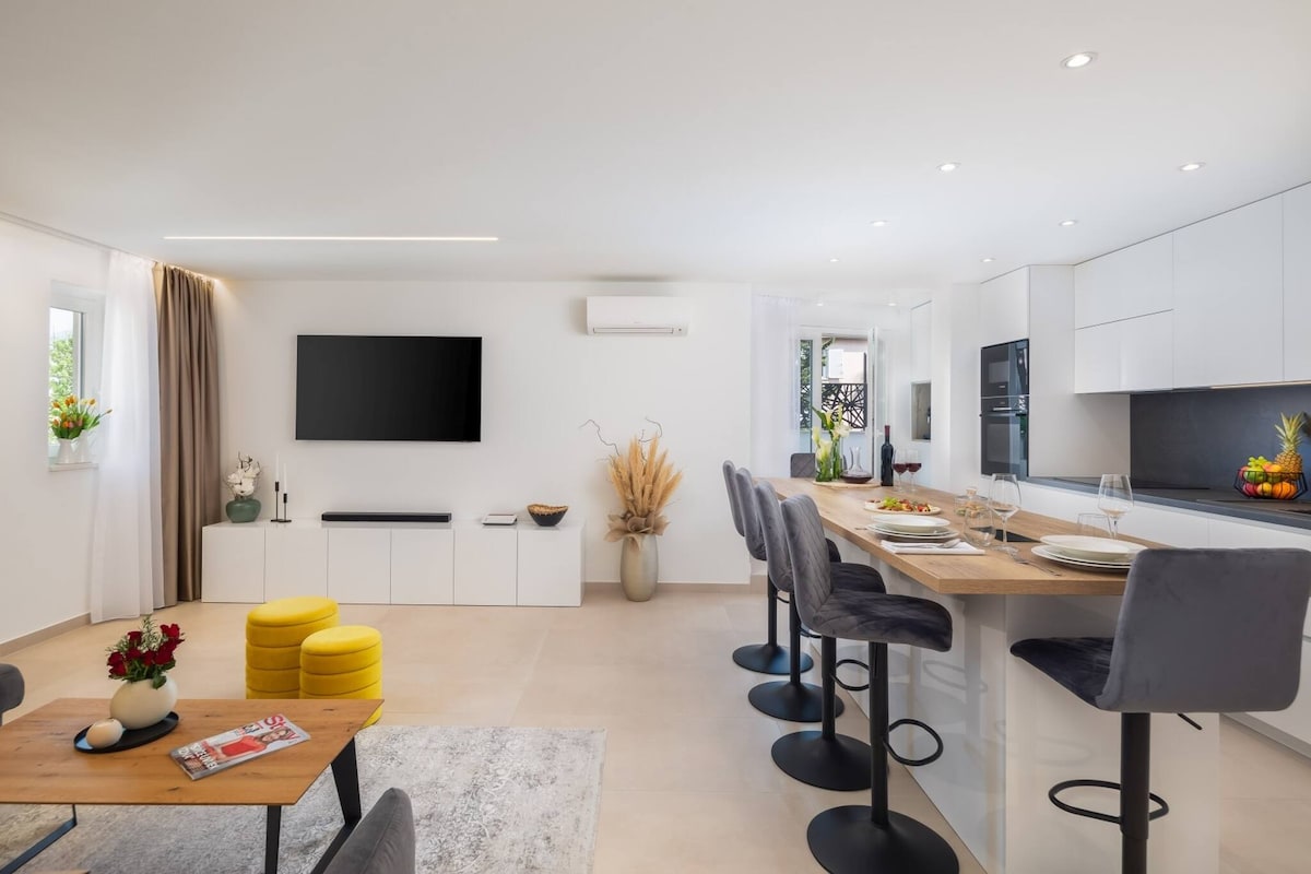 Patirkite rojų šiame moderniame 130 kv. m bute, įsikūrusiame žavingame kaime netoli Adrijos jūros. Su išskirtine prieiga prie įvairių nuostabių patogumų, įskaitant garso kambarį, kino teatrą/PS4+PS5 žaidimų kambarį ir SPA zoną su sauna ir masažu pagal poreikį. Atsipalaiduokite sūkurinėje vonioje, panirkite į šildomą baseiną su kepsninių zona ir apžiūrėkite vietovę su 4 MTB (įskaitant du elektrinius). Jūsų laukia tobula išvyka!