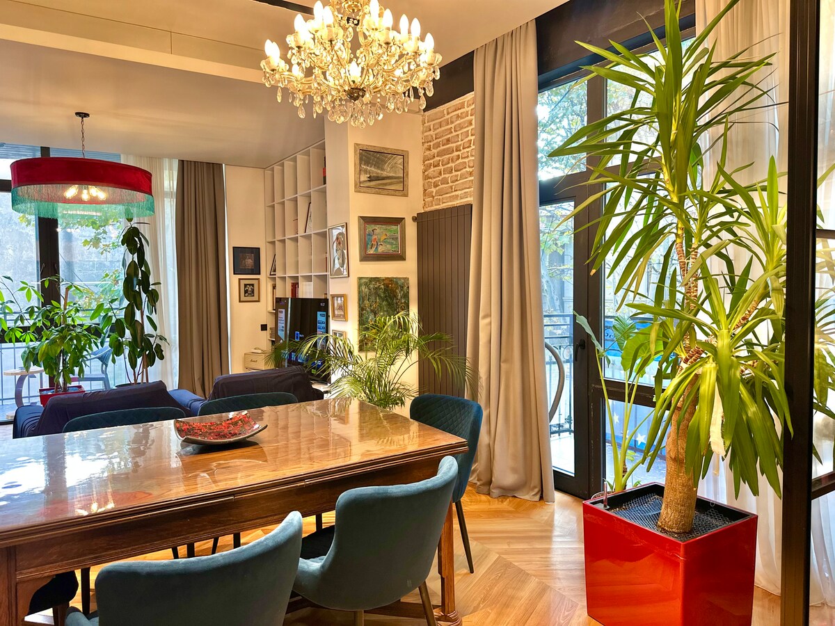 Mėgaukitės stilingais potyriais šiame centre esančiame būste. Apsistoję šiame meno įkvėptame ir dizainerių bute mėgaukitės nuostabiu vaizdu pro mūsų langus. Gražiai dekoruoti ir stulbinančiai unikalūs kambariai su sienomis. Kavos virimo aparatas ir kiti prietaisai jūsų patogiai viešnagei. Kuo išsiskiria mano būstas? - Vieta, dekoracijos, vaizdas. Šis būstas puikiai tinka poroms, ieškančioms ramios vietos ir nuostabaus vaizdo Tbilisio centre. Nekantrauju jus priimti!