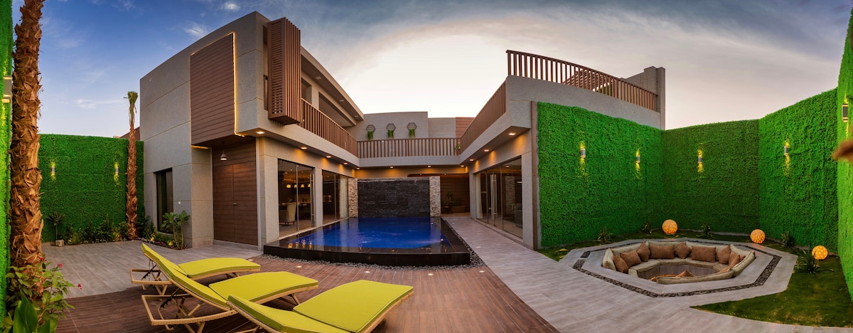 Unikalus architektūrinio dizainerio poilsio namelis Jis yra netoli sostinės Rijado šiaurinės dalies, toliau nuo miesto šurmulio, todėl galėsite mėgautis ramia viešnage. Jai būdingas ne tik papildomas majlisas arabų sesijoje, bet ir nuostabus vaizdas į šventovę ir lauko sodą, kad užtikrintumėte nepamirštamą patirtį jūsų renginiams ir vestuvėms.