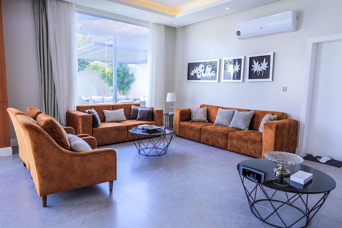 Prabangi 450 kv. m vila, kurioje dera elegancija ir ramybė, idealiai įsikūrusi Al Thumama kelyje, vos už 15 minučių kelio nuo Karaliaus Khalido tarptautinio oro uosto. Yra pagrindinis miegamasis su karališka lova, pilnai įrengta virtuvė, stilinga valgomojo zona, privatus baseinas ir lauko poilsio zona, apsupta žalumos. Puiki vieta ieškantiems komforto, privatumo ir atsipalaidavimo. 🌿
