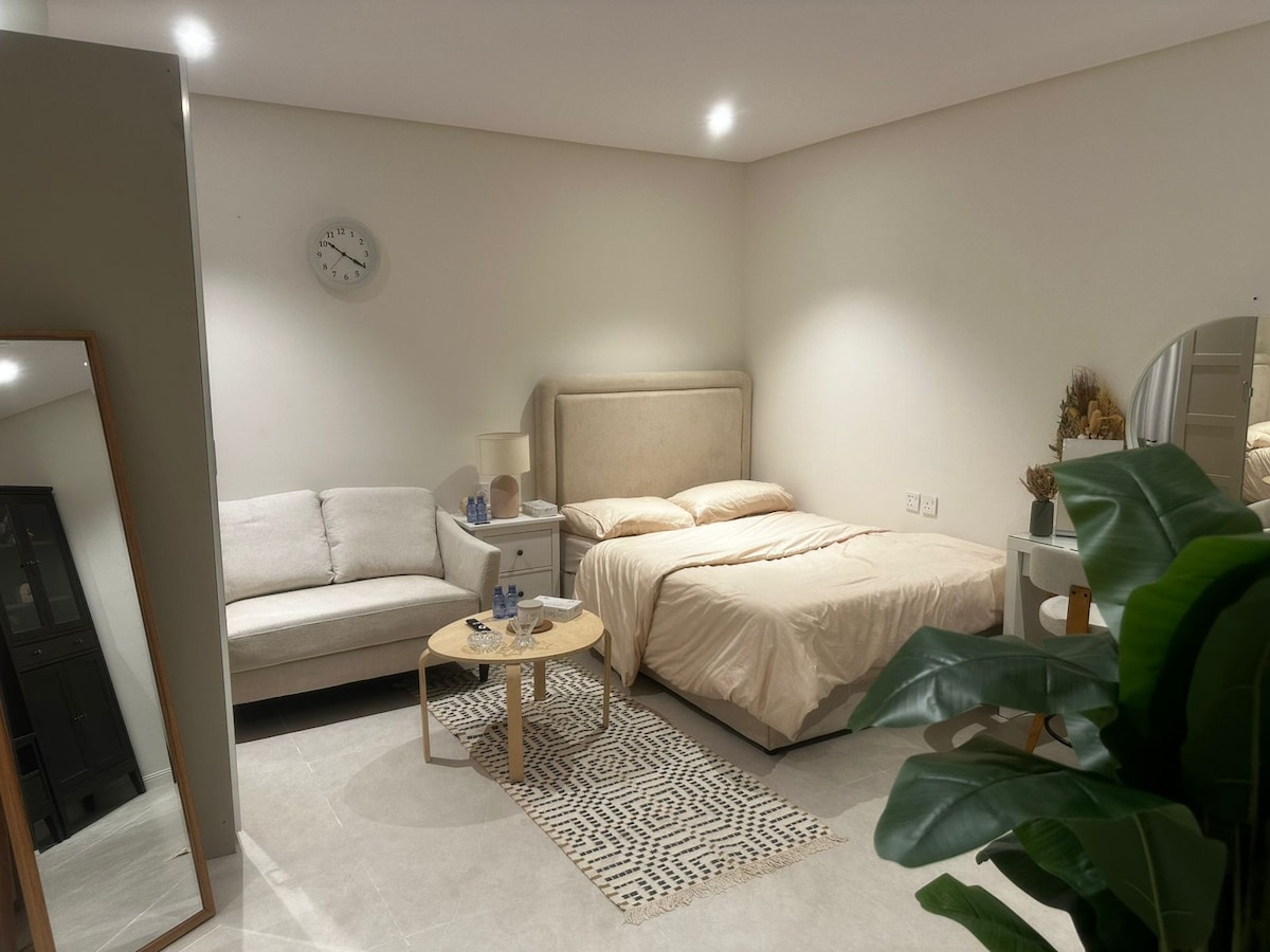 Experience a unique experience in a private Artist Studio offering relaxation and comfort. The studio includes a bed and a side seating area where you can enjoy watching on a 65-inch smart screen. There's also a separate kitchenet and a coffee to serve all your needs and stylish outdoor area with fire pit. location is close to all services, the tourist destination, and Riyadh Season areas (Boulevard,Arena,Etc) within a 5-minute. We would love to host you and share the experience with us!