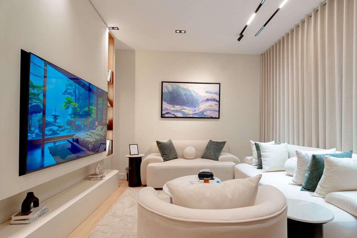 Mėgaukitės prabangiu išmaniuoju butu Šiaurės Rijade, kuriame modernus dizainas dera su didžiausiu komfortu. Vos už 15 minučių kelio nuo oro uosto, už 10 minučių kelio nuo Rijado sezono lankytinų vietų ir už 10 minučių kelio nuo istorinės Dirijos. Yra pliušinė karališko dydžio lova, 75colių QLED televizorius, didelės spartosWi-Fi ir nemokama automobilių stovėjimo aikštelė — puikiai tinka poroms, pavieniams keliautojams ar verslo kelionėms.
