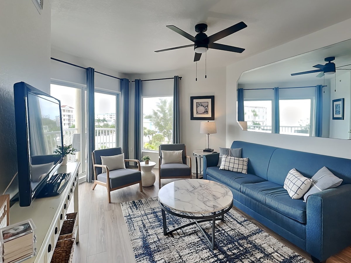 Lobių salos naujausias kondominiumų kurortas! 992 kv. pėdų prabanga tiesiai paplūdimyje. Negabaritinis 2 miegamųjų kondominiumas. Jūsų šiuolaikiškame būste yra 2 miegamieji ir 2 pilni vonios kambariai bei ištraukiama sofa atviroje gyvenamojoje erdvėje. Už svetainės yra jūsų gražus vaizdas. Eikite į savo privatų balkoną pro ištraukiamas stumdomas duris. Čia galite mėgautis puodeliu kavos stebėdami, kaip dangus šviesėja auštant, arba pasiimti vėsaus gėrimo, kad pasimėgautumėte stebuklingu saulėlydžiu.