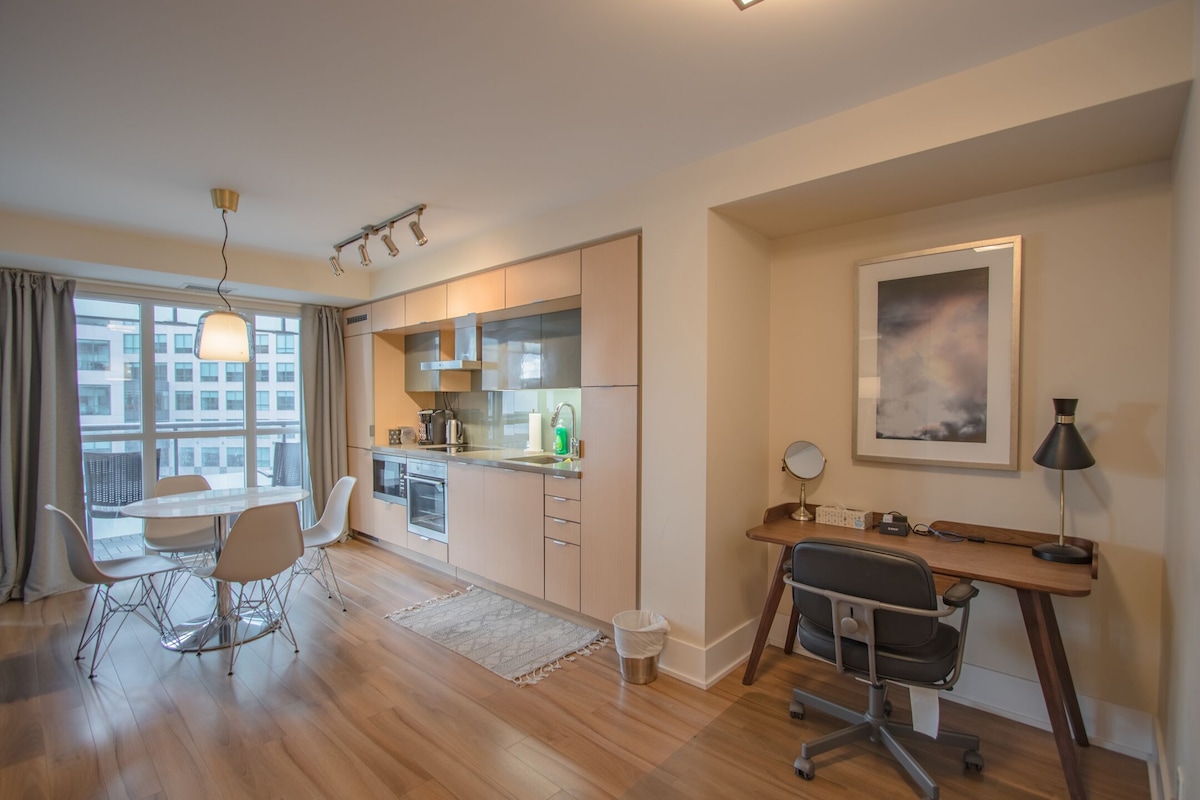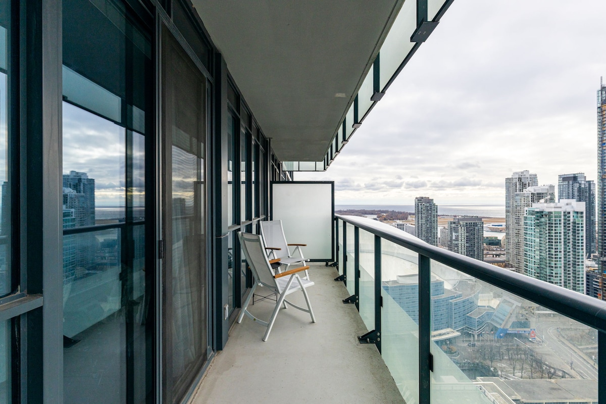 *NAUJAS SKELBIMAS NEBUS PASKUTINIS* Sveiki atvykę į mūsų gražų kondominiumą pačioje Toronto centro širdyje. Laiptai nuo Rodžerso centro, Maple Leaf aikštės, CN bokšto, MTCC, Tiff pastato, restoranų, parduotuvių ir kt. Be to, moderniausi patogumai: sporto salė, sūkurinė vonia, pirtis! Šis kondominiumas yra šviesus, atviras, su gražia privačia terasa ir vaizdu į miestą. Apartamentuose yra „Queen Endy“ lova miegamajame, patalynė su valgomojo zona/darbo erdve, vonios kambarys su vonios kambariu, prabangus lietaus dušas ir moderni atnaujinta virtuvė. Sveiki sugrįžę namo!