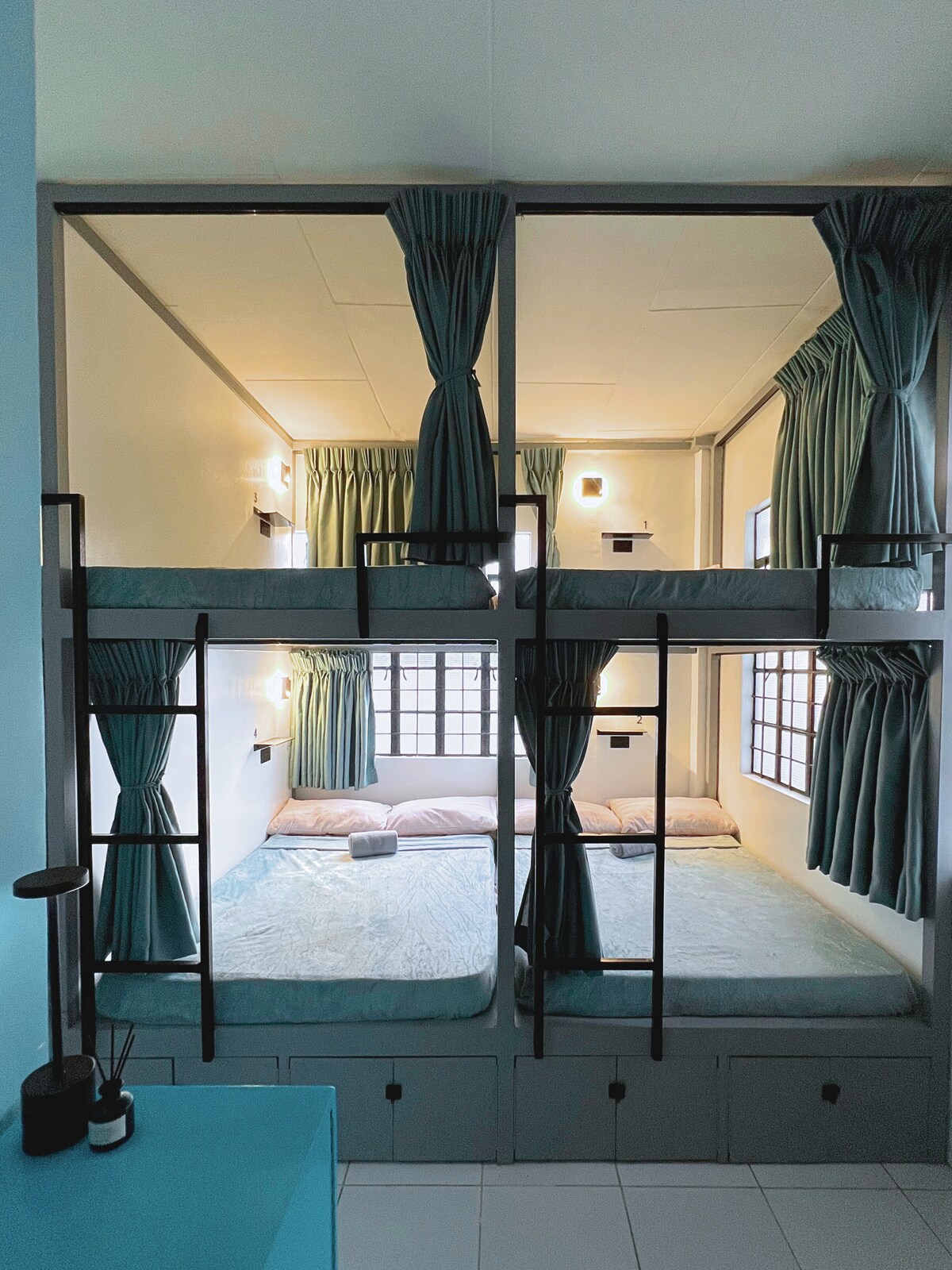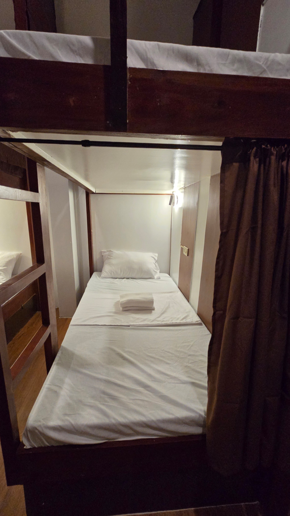 Apsistokite mūsų išmaniajame vienguliame dviaukštėje lovoje, kuri puikiai tinka solo keliautojams, draugų grupei ar net šeimai — bendrame bendrabutyje su moderniu dizainu ir portugališku žavesiu. Kiekviename jaukiame kampelyje yra užtemdančios užuolaidos, minkštas apšvietimas, programėlės briauna, įkrovimo prievadas, drabužių stovas ir rankšluostis. Mėgaukitės švariu lauko vonios kambariu su dušu po atviru dangumi ir saulės apšviestu tualetu - gaivinančiu salos potyriu. Atraskite Coron gamtos grožį iš išmanios, stilingos bazės pačioje miesto širdyje.
