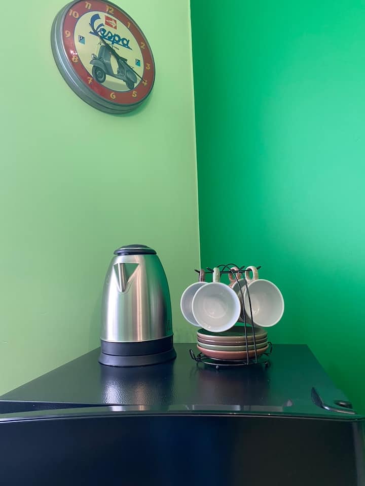 Bus lengva tinkamai pradėti rytą, nes čia yra rankinis kavos aparatas ir prancūziškas kavinukas.