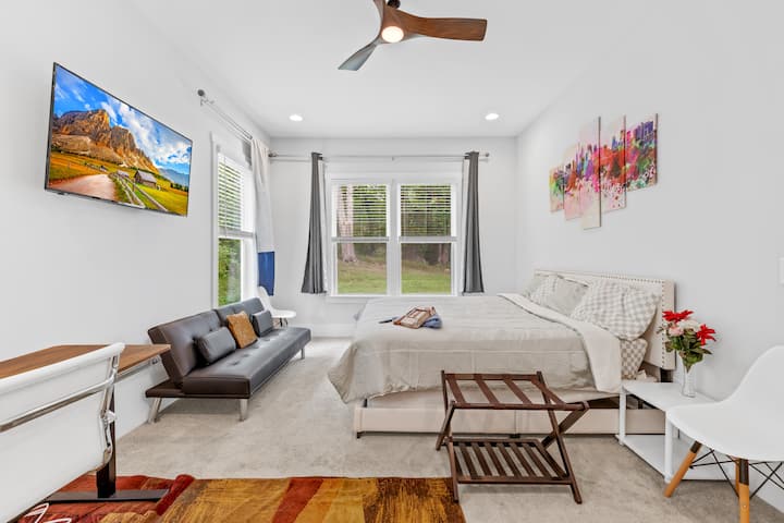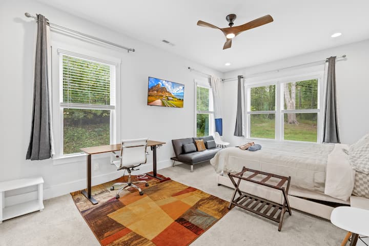 Pagrindinis miegamasis naujame, išmaniajame, erdviame, su vaizdu į upelį
