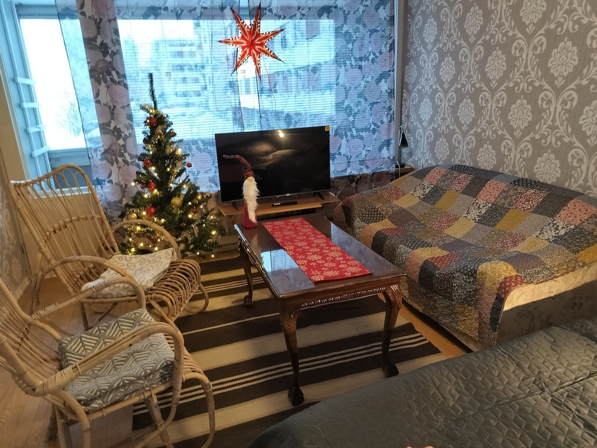 This is a nice, one bedroom clean and comfortable apartment with sauna and balcony! Four people sleeps comfortable on a queen size double bed and sofa bed. In addition, there is also two extra mattresses. Close to the apartment there is a shop and the cultural center of Korundi is a short walk away! You also have a 50 "TV with Chromecast.