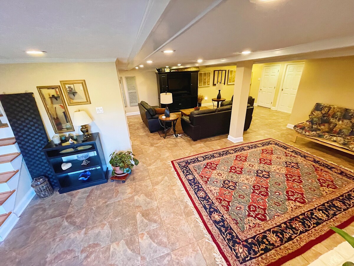 Viešnagė sodyboje pačioje Kentukio Bluegrass širdyje 20 min. nuo KY arklių parko ir Leksingtono centro. 30 min. iki Keenelando. 45 min. iki Raudonosios upės tarpeklio. Tylus, privatus rūsio butas su 2 miegamaisiais, puikiu kambariu, futbolo kamuoliu ir liokajaus sandėliuku su kavos virimo aparatu, mažu šaldytuvu, mikrobangų krosnele ir pagrindiniais virtuvės reikmenimis. Erdvė nėra bendro naudojimo. Valgykite patalpoje arba lauke, laužavietę ir arklius/galvijus. Iki 2 gerai besielgiančių šunų su šeimininkų išankstiniu patvirtinimu. Šunų negalima palikti vienų. Ne mažiau kaip 2 naktys, maks. 10.