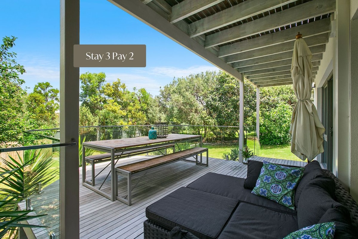 * Sutaupykite: 20% nuolaida Viktorijos laikų mokyklos šventėms * Šis gražiai dekoruotas, gerai įrengtas paplūdimio namas Rye, Viktorijoje, yra puiki vieta apsistoti ieškantiems stiliaus ir patogumo. Mėgaukitės nuostabia Moonah medžių aplinka iš erdvios privačios terasos, puikiai tinkančios kepti ant grotelių arba pasimėgauti saule. Šis paplūdimio namas, esantis pačioje Morningtono pusiasalio širdyje, yra vos už kelių minučių kelio nuo Peninsula Springs, vyno daryklų, golfo aikštynų, kavinių ir paplūdimio paplūdimių.