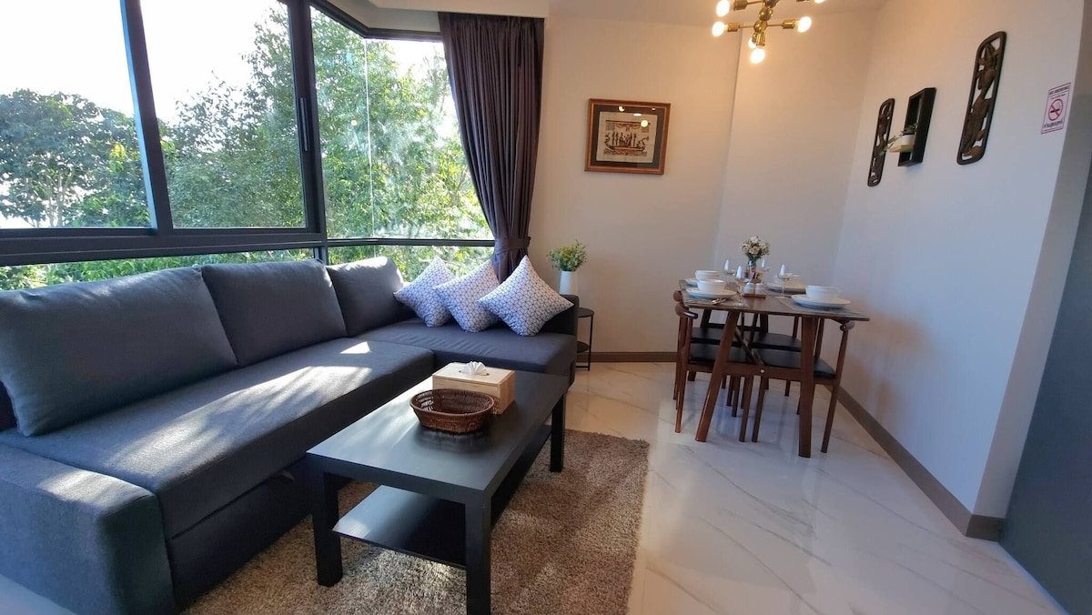 Puikiai tinka poroms ir šeimai. Saulėtas butas su geriausia vieta Ao Nang - už 7 minučių kelio pėsčiomis nuo 2 paplūdimių - Noppharathara ir Ao Nang. Jame yra oro kondicionierius su patogia karališko dydžio lova, atskirta nuo svetainės su stumdomomis durimis. Konvertuojama sofa leidžia apgyvendinti dar du svečius. Pilnai įrengta virtuvė ir valgomojo zona su televizoriumi. Balkonas su vaizdu į žalią kalvą, pilną paukščių. Bendras baseinas, pirtis ir sporto salė.