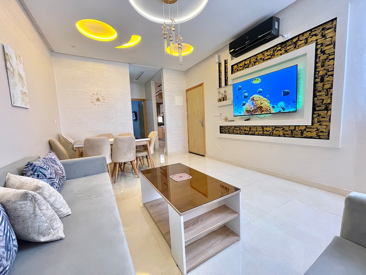 Šis visiškai naujas ir unikalus būstas už 15 min. kelio pėsčiomis iki paplūdimio netoli visų vietų ir patogumų, restoranų, prekybos centrų kavinės ir kt. Taip pat mėgaukitės kepsnine ir privačia šeimos sūkurine vonia su LED apšvietimu jūsų atsipalaidavimo vakarams po paplūdimio. Taip pat turėsite ORO KONDICIONIERIŲ. NEMOKAMA AUTOMOBILIŲ STOVĖJIMO AIKŠTELĖ ir prižiūrėtojas . Pusryčių užkandis, msemen harcha, viskas yra pastato papėdėje. Apsaugokite butą ramiai viešnagei su šeima.