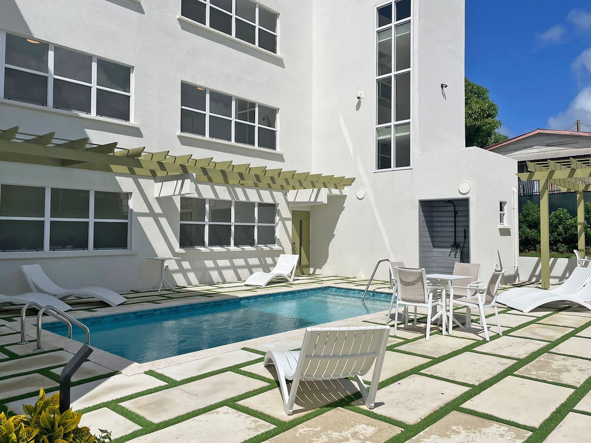 Visiškai naujas stilingas kondominiumas, esantis už kelių žingsnių nuo 2 puikių Vakarų pakrantės paplūdimių; vienas gražus ir tylus, o kitas - šurmuliuojantis Mullins paplūdimys. Lengva pasiekti Speighstown ir Holetown viešaisiais autobusais. Netoliese yra tokie restoranai kaip „Seashed“, „Larry Rogers“, „Local and Co“, „Orange Street Grocers“, „Baia“ ir „Pier One“. Šis kondominiumas yra labai skoningai įrengtas su švaria apdaila. Šeimininkas turi karališką lovą, o antrame kambaryje yra du dvyniai, kuriuos galima paversti karaliumi.