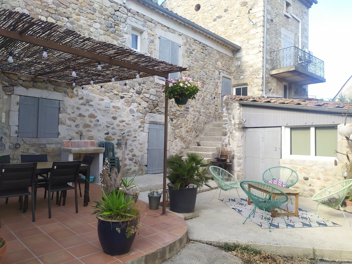 Žavingas akmeninis sodybos namas su oro kondicionieriumi ir belaidžiu internetu. Flowered and wooded garden. Baseinas, sodas su sezoniniais vaisiais ( obuoliais, vyšniomis, svarainiais).. Šešėliuota terasa su laužaviete ir prijungtu baseinu. Privatus priėjimas prie netoliese esančio miško pasivaikščiojimui. Atsipalaidavimo zona su lauko žaidimais.. stalo tenisas, molkky mikado milžinas, petankė, ..Sportininkams, žemyn Ardeche, kanjoningas ir tenisas netoliese . Į tvarkymo mokestį įskaičiuota patalynė ir rankšluosčiai 6 asmenims