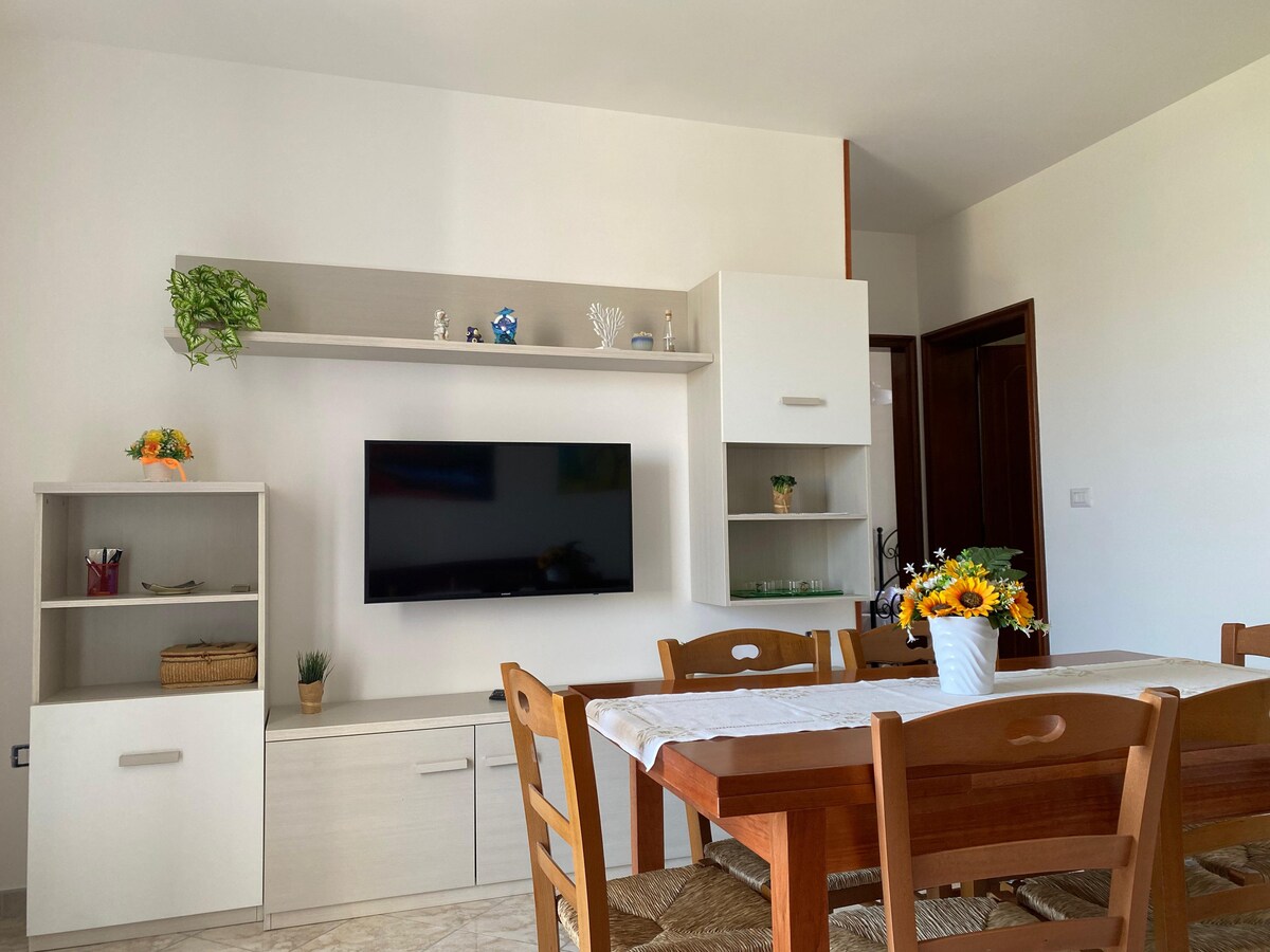 Salento, San Foca, naujas dviejų kambarių butas vos už 100 metrų nuo smėlio paplūdimio. Bute yra svetainė su virtuvėle ir dvigule sofa-lova, dvivietis miegamasis, vonios kambarys su dušu. Galimybė pridėti kempingo lovelę. Visi patogumai, TV, skalbimo mašina, vieta automobiliui, didelė terasa, įrengtas lauko stalas ir kėdės, dviračiai. Penkių minučių pėsčiomis iki San Foca centro. Rami ir rami vieta, prekybos centras už trijų šimtų metrų.
