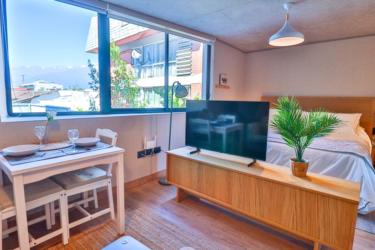 Moderni, gerai prižiūrima studija Santjage, ramioje La Florida vietovėje, vos už 2 min. 🚇 nuo Bellavista La Florida metro stoties ir Vespucio prekybos centro. Viskas pasiekiama pėsčiomis: prekybos centrai, klinikos, vaistinės, restoranai ir būtiniausios paslaugos. Puikiai tinka poroms, turistams ar verslo keliautojams. Yra oro kondicionierius ❄️, spartusis WiFi 📶, įrengta virtuvė, 55 colių išmanusis televizorius, modernus vonios kambarys su bidė ir džiovinimo funkcija 🚿, darbo ir valgomojo stalas 💻, terasa su vaizdu į miestą ir kalnus 🌃 bei paprastas savarankiškas atvykimas.