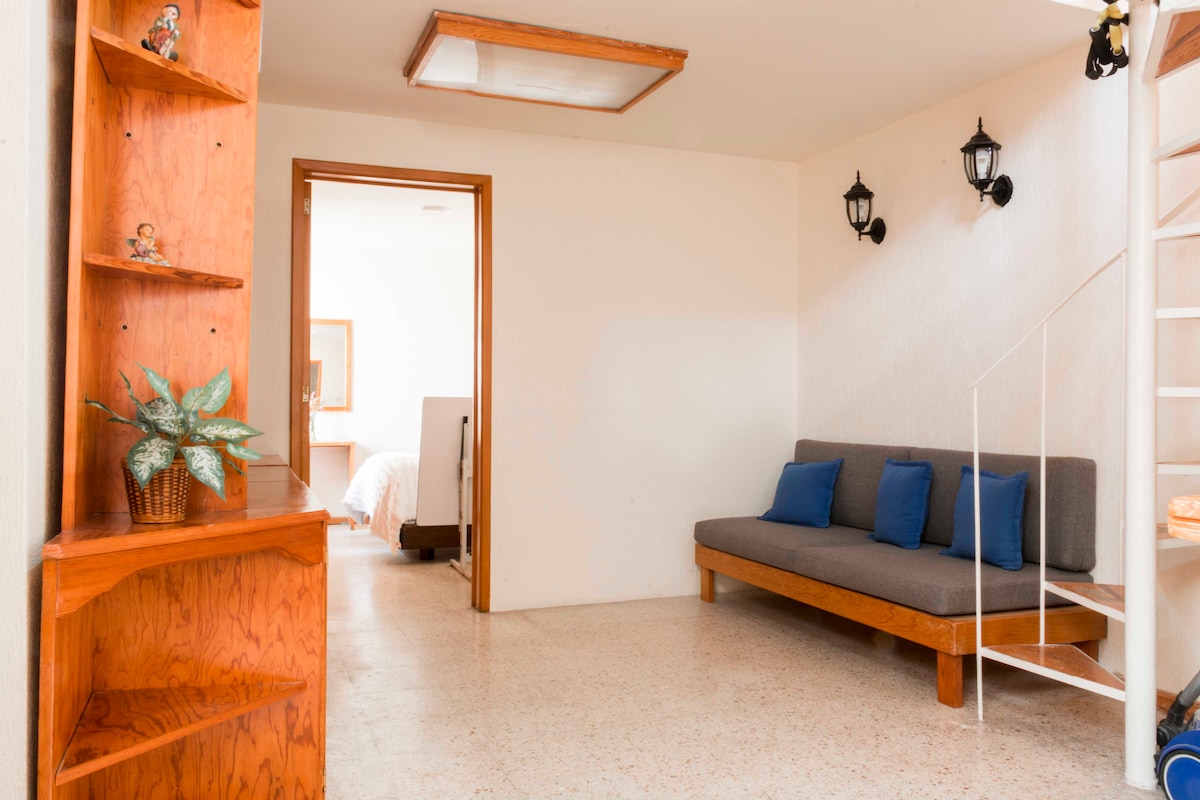Este loft es ideal para familias o grupos, personas mayores o quienes vienen a SLP por tratamientos hospitalarios. Amplio, cómodo y en planta baja. Cuenta con cocina equipada, sala con sofá cama, recámara independiente con cama matrimonial, patio privado, WiFi, TV y baño completo. El espacio es muy tranquilo, seguro y con un ambiente hogareño. Perfecto para descansar, cocinar, convivir y recuperarse. Cuentas además con acceso a áreas comunes del edificio en el nivel 3.