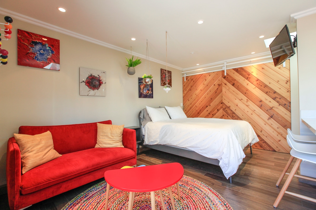 Mėgaukitės kava zen, vynmedžiu apsuptame kieme šiame nuošaliame kotedže, esančiame Berklio laikotarpio pastato gale. Ryškios baltos paklodės, amatininkų baldai ir dažytos medinės apdailos yra rafinuotas, bet kaimiškas prieglobstis. Pagrindinis kambarys yra jaukus su dideliu stoglangiu, patogia karališka lova, pasukama kėde, stalu ir kėde. Yra nedidelė virtuvėlė. Lauke yra akmeninė terasa, sūpynės suolas, iš kurio atsiveria vaizdas į koi tvenkinį, ir mažas lauko stalas bei kėdės. ZCSTR2021-0842