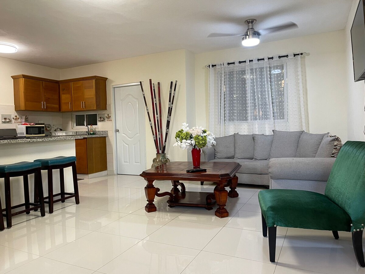 Atraskite modernią ir centrinę erdvę, esančią vos už dviejų kvartalų nuo Tetelo Vargas stadiono ir vietinių prekybos centrų bei už 15 minučių nuo gražių Juan Dolio paplūdimių. Bute yra oro kondicionierius tiek svetainėje, tiek miegamajame, kuriame yra patogi karališko dydžio lova, o svetainėje yra sofa-lova. Be to, mėgausitės Wi-Fi, pilnai įrengta virtuve ir skalbimo zona, skirta patogiai ir nepamirštamai viešnagei.