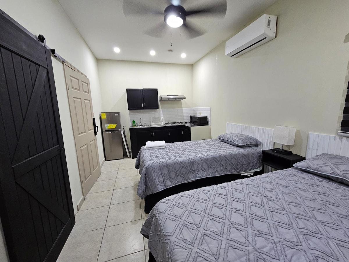 Bienvenidos a Estancia los Laureles. Un espacio diseñado para viajeros u oficinistas de paso en San Pedro Sula. El apartamento es de dos espacios. En un espacio esta la habitación con una cama queen y una unipersonal el baño y aire acondicionado y en el otro espacio cocina, sofa cama y desayunador y ventilador. No tenemos agua caliente. Disponemos Dos Tv Smart y una cocina equipada con Estufa y refrigeradora, cafetera y microondas. Parqueo para 1 auto.