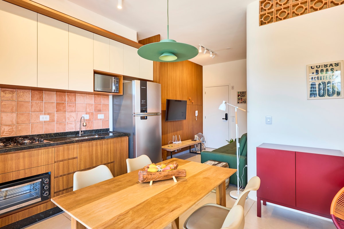 Nauja architekto pasirašyta dizaino studija, labai graži ir patogi. Jis yra už 400 m nuo Orla da Praia do Perequê Açú. Turime: išmanųjį televizorių, šviesolaidinį Wi-Fi, savo erdvę darbui, įrengtą virtuvę, kepsninę balkone ir kvapą gniaužiantį vaizdą į Atlanto mišką. Pastate yra baseinas, picerija, dušas ir garažas su elektroniniais vartais. Jis yra labai geroje vietoje, netoli Centro e Rua Turística, be greitkelio.