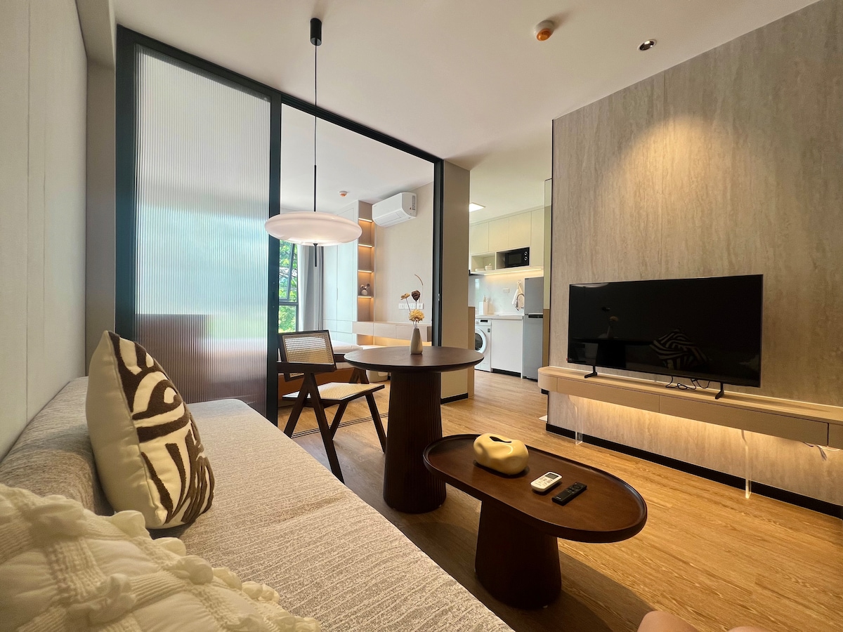 Brand New 2 Bedroom condo, peaceful but close to the city just 10 minutes to the old town, 5 minutes to the airport, long swimming pool, peaceful atmosphere, suitable for relaxation high privacy The atmosphere of the condo is quiet and peaceful, reminiscent of a resort. It is surrounded by lush green trees and features a longer swimming pool compared to others in the area, perfect for swimming and relaxation.