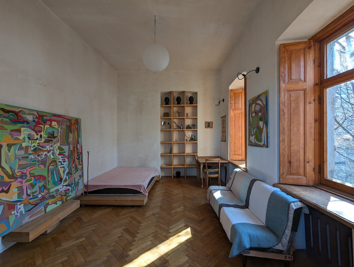 Naujai suremontuotas, jaukus butas (100 kv.m.), jugendo ir šiuolaikinio meno mišinys, esantis miesto centre, 5-10 min. pėsčiomis iki pagrindinės gatvės - Sh. Rustaveli av. Čia rasite viską, kas reikalinga viešnagei. Butas yra ketvirtame aukšte, yra liftas. Bloko apačioje yra puiki gruzinų virtuvės kavinė su pramogomis.