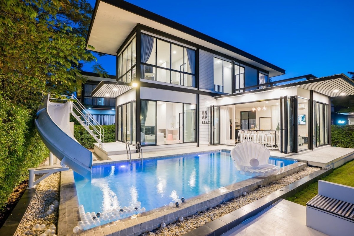 Movenpick baseino vila, sukurta ANGKAN V4 - Smagiai praleiskite laiką su visa šeima šioje stilingoje vietoje. - Išskirtinė atmosfera viduje ir lauke, graži vieta šeimai, šventėms, atostogoms ir darbui. - Visiškai nauja prabangi vila veikia 2022 m. spalį - 5 miegamieji, 6 vonios kambariai, 23 vonios, 10 svečių ir papildoma lova iki 17 svečių - Valgymas patalpose daugiau nei 20 vietų ir lauko durys ant grotelių prie baseino 14+ - Visos patalpos, buitiniai prietaisai ir patogumai, pvz., jūsų vila. - Slankiklis, sūkurinė vonia - Poo stalas - Elektromobilio įkroviklis, papildomas