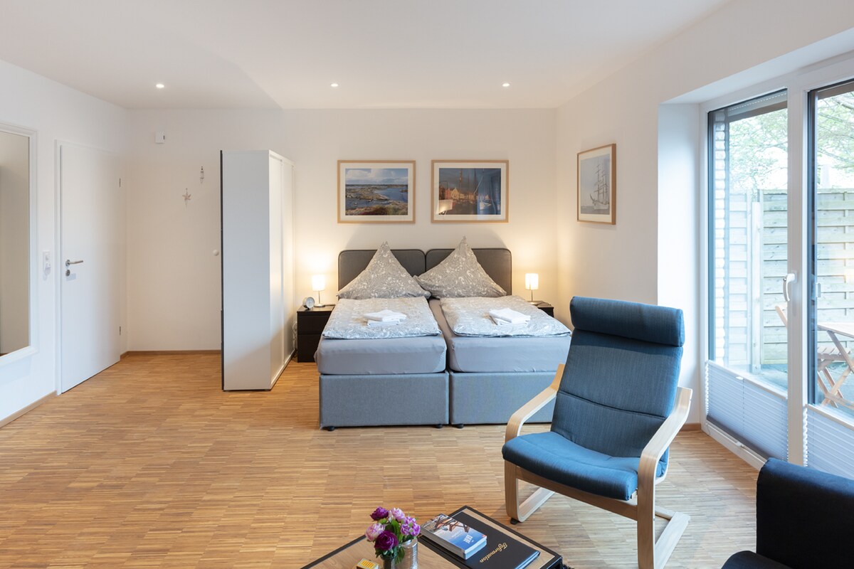 - Einlieger apartamentai naujame danų bungalow -14 kv.m. svetainė/miegamasis su dvivėrėmis durimis į savo terasą. 160cm pločio sofa-lova - Apytiksliai 5,5 kv. m įėjimo zona su virtuvėle - Vonios kambarys su dušu - Durys apytiksliai 6,7 kv. m 1 m pločio -Parkavimas prie namo - vieta mažo kaimo Kiesby pakraštyje, Angeliter kalvos su vingiais, miškai, ežerai ir pakrantės -Schlei apie 3 km. -Žiūrėti apie 20km -Senas Šleibriukas Lindaunis apie 4km -Arnis an der Schlei apie 7km -Kapelnas apie 10km
