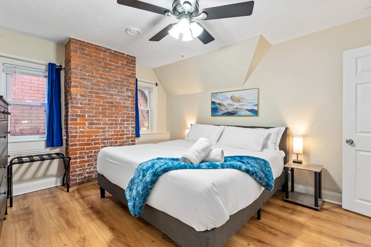 Jei esate toks keliautojas, kuris nori būti už kelių žingsnių nuo linksmybių, tai yra jūsų namai! Mūsų antrame aukšte yra gerai įrengta virtuvė, kokybiški patogumai, išmanieji 4K televizoriai (įskaitant miegamąjį), karališko dydžio lova, 2 stalai (2 atskiruose kambariuose, puikiai tinka darbui iš namų) ir dar daugiau! Trys alaus daryklos ir daugiau nei 20 barų bei restoranų yra už 3 kvartalų nuo jūsų būsto. Puikiai tinka, kai norite nakvoti, bet su mūsų jaukia vieta jums bus pagunda apsistoti ir atsipalaiduoti žiūrėdami Netflix!