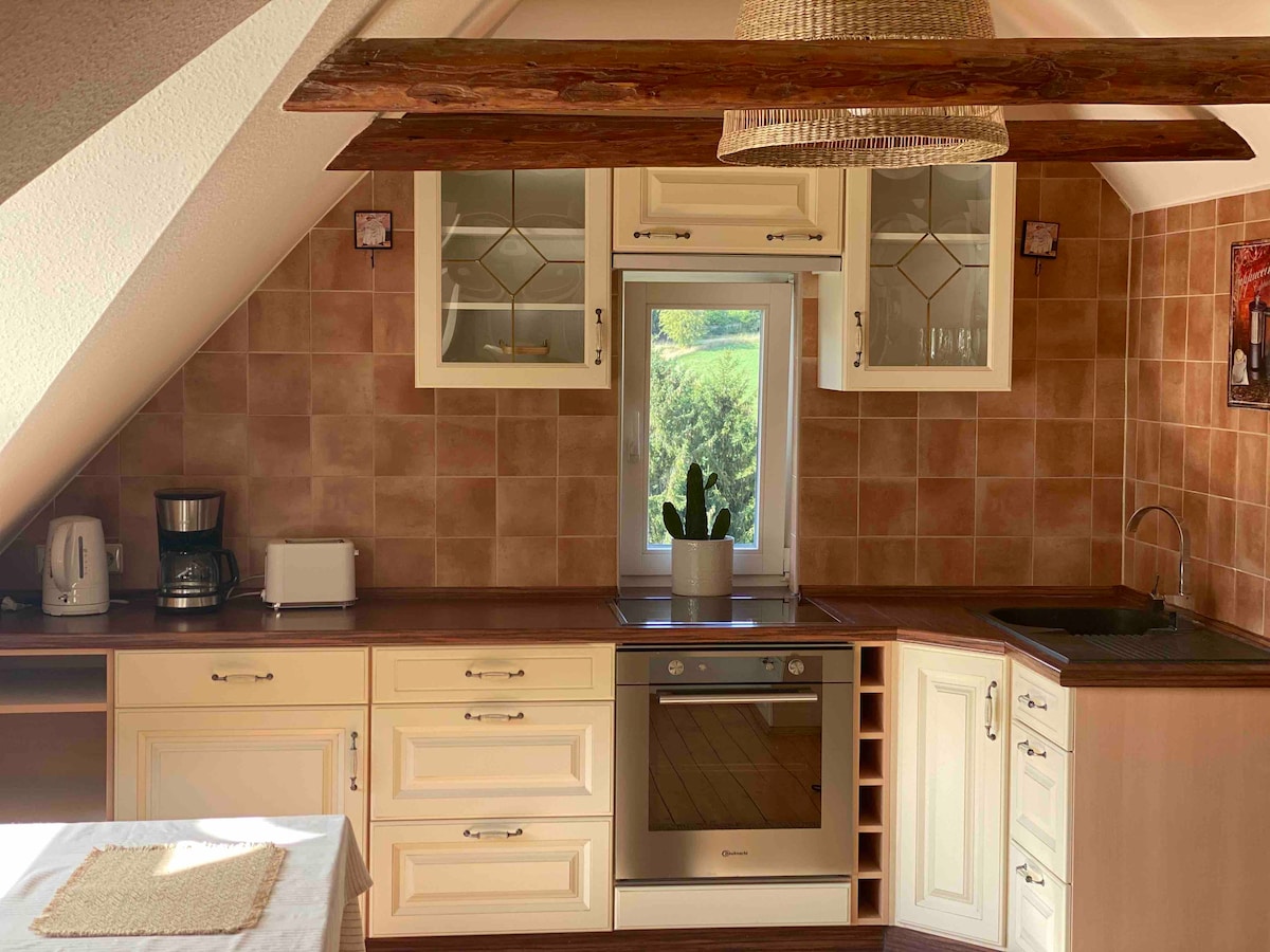 * Jaukus kotedžas su fantastišku vaizdu į kaimą * Rami vieta Bad Sulza pakraštyje, tiesiai ant Ilmradweg * SPA parkas ir patogumai, Toskanos SPA, klasės, lauko baseinas, vyno daryklos, prekybos centras ir traukinių stotis vos už kelių minučių pėsčiomis * Jauki virtuvė - svetainė su židiniu, dideliu plokščiaekraniu televizoriumi ir Wi-Fi * Didelė terasa su kepsnių zona * Miegamasis dvigulėje lovoje, sulankstoma sofa svetainėje * Naujas vonios kambarys su lietaus dušu ir tualetas * Atskiras būstas, griežta higiena, lankstus atšaukimas